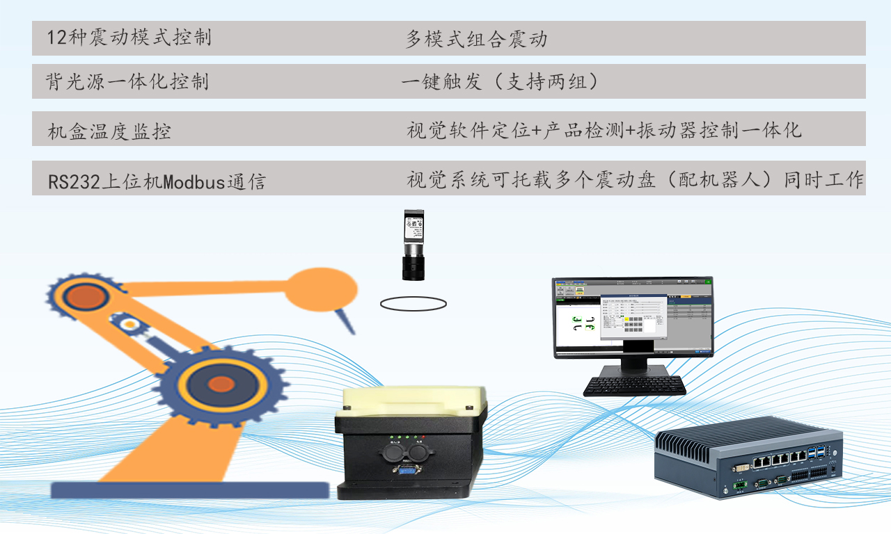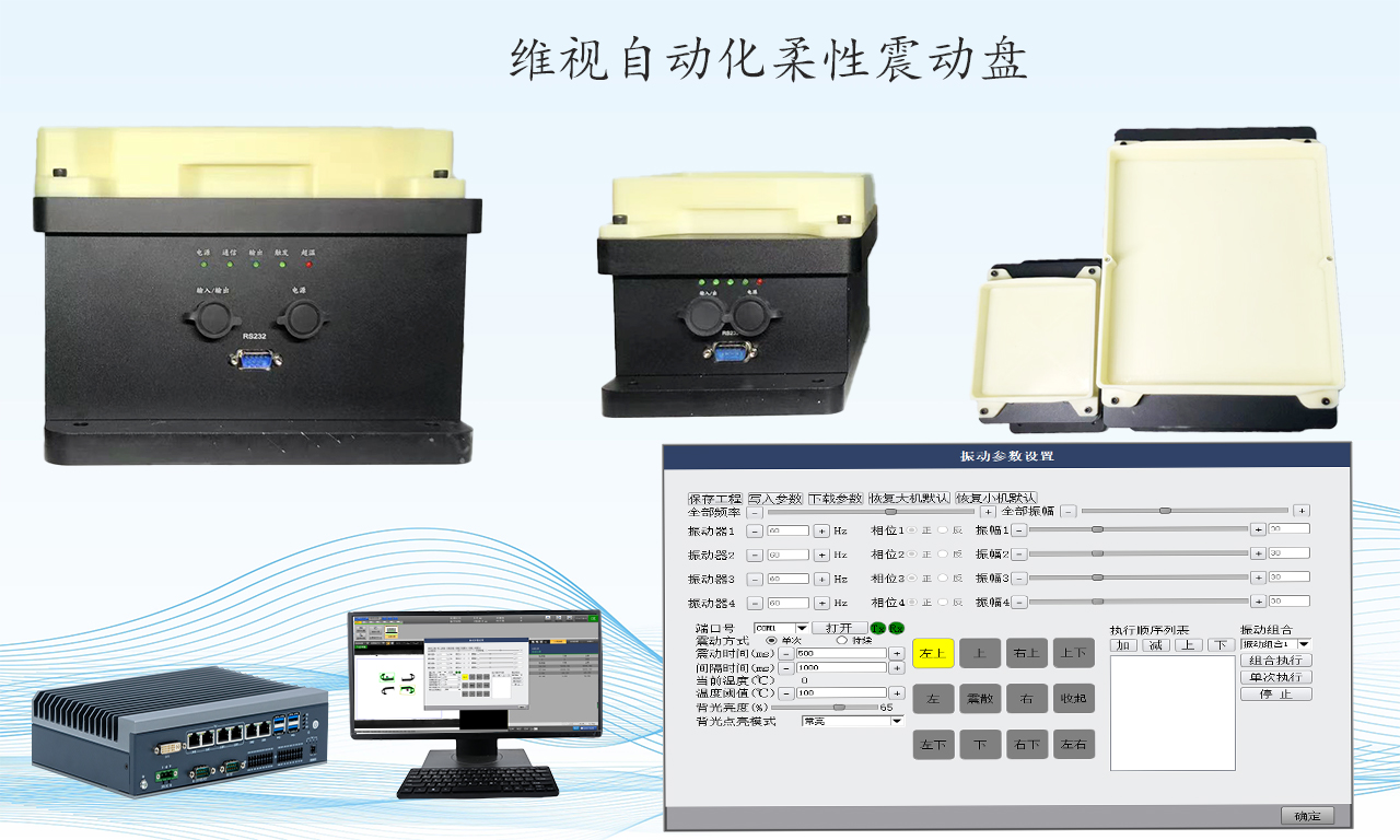 深圳維視自動化技術科研開發有限公司自主研發的柔性震動盤具備運行穩定,led背光一體(不用外界接led背光),光源頻閃觸發控制(增加led背光使用壽命),具備十二種震動方式,有信號觸發開啟多種組合震動方式的功能。與上位機軟件進行Modbus協議通訊。公司的柔性震動盤的核心優勢是自主研發,顧客可以更快更低的成本開展項目。此外深圳市維視自動化技術開發有限責任公司自身是一家致力于機器視覺技術開發的企業,在視覺系統開發設計方面有很大的優點。柔性震動盤配合公司的標準化視覺系統有震動視覺一體化的優勢。